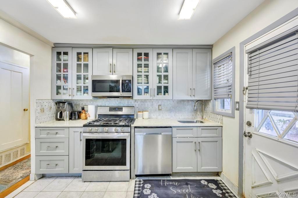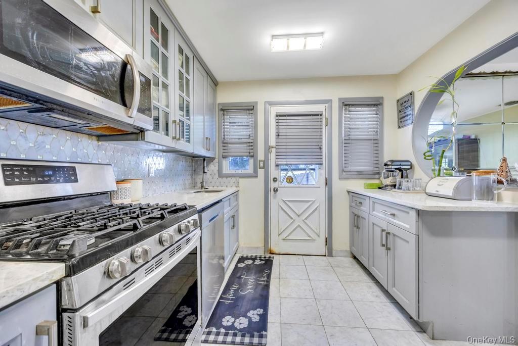 - Kitchen featuring stainless steel appliances, gray cabinets, light tile patterned floors, backsplash, and glass insert cabinets