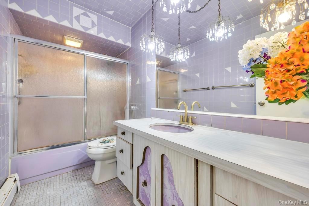 - Full bath featuring tile walls, shower / bath combination with glass door, a baseboard heating unit, and vanity