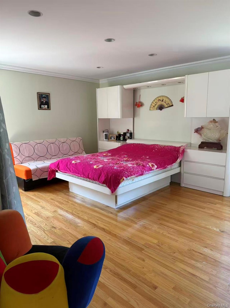 - Bedroom featuring light wood-type flooring, ornamental molding, and recessed lighting