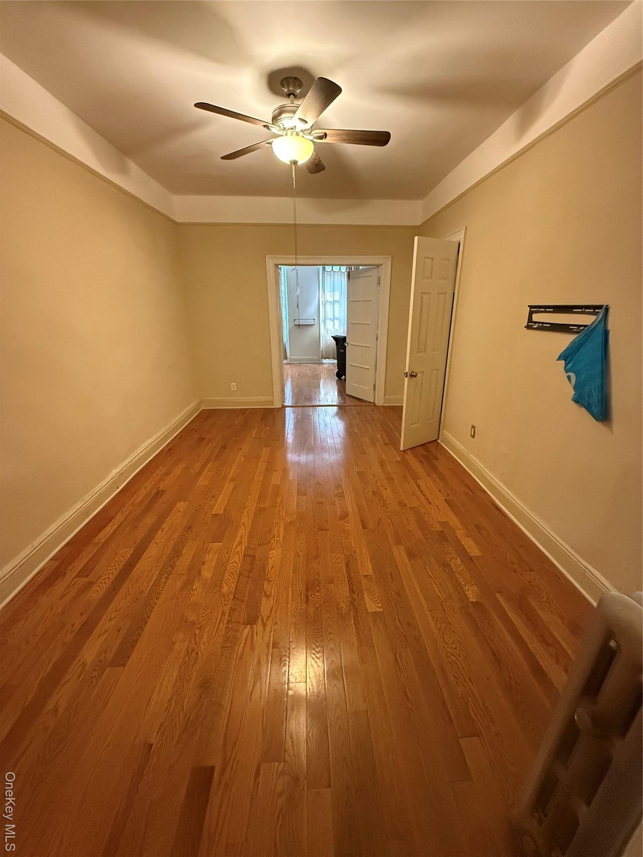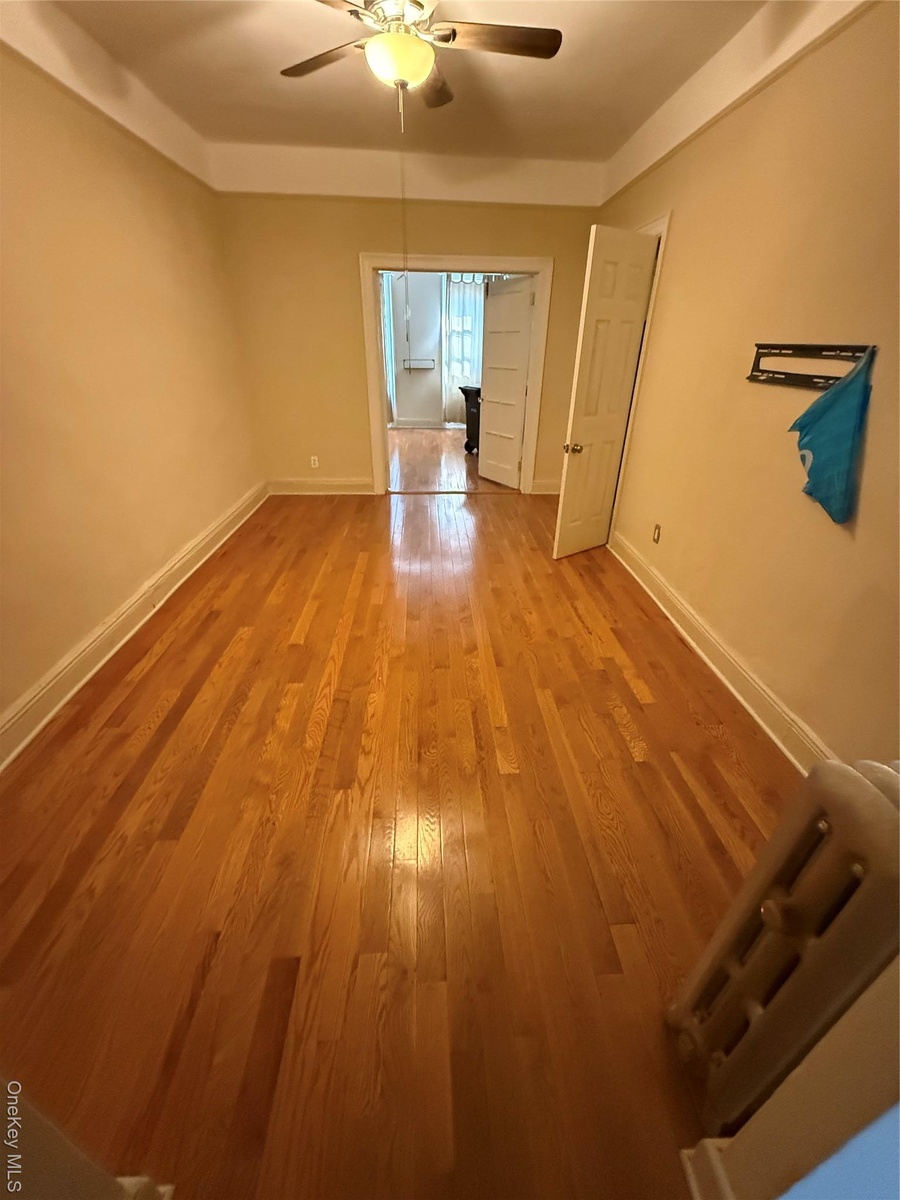 - Unfurnished bedroom featuring light wood-type flooring and ceiling fan