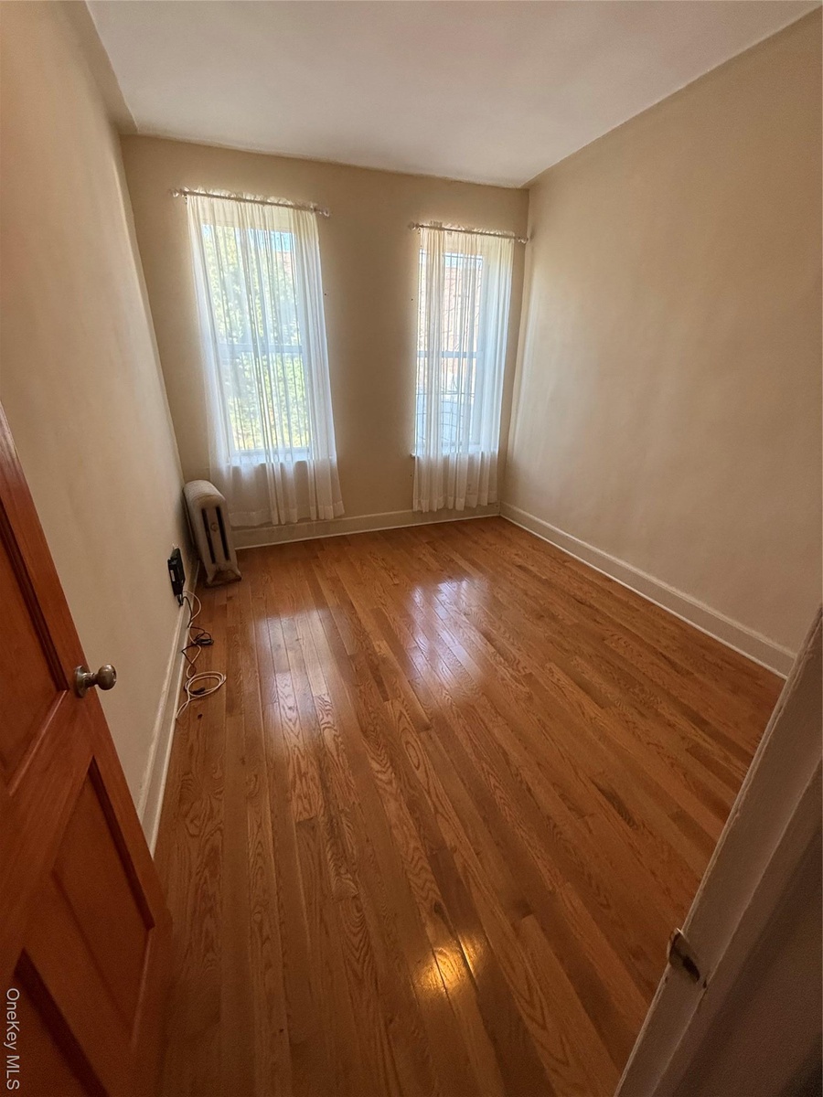 - Unfurnished living room with light wood-style flooring and radiator heating unit