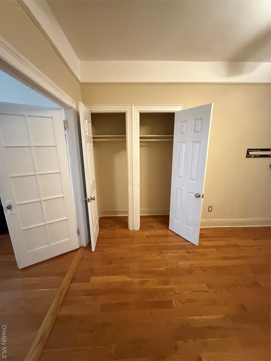- Unfurnished bedroom featuring wood finished floors and a closet