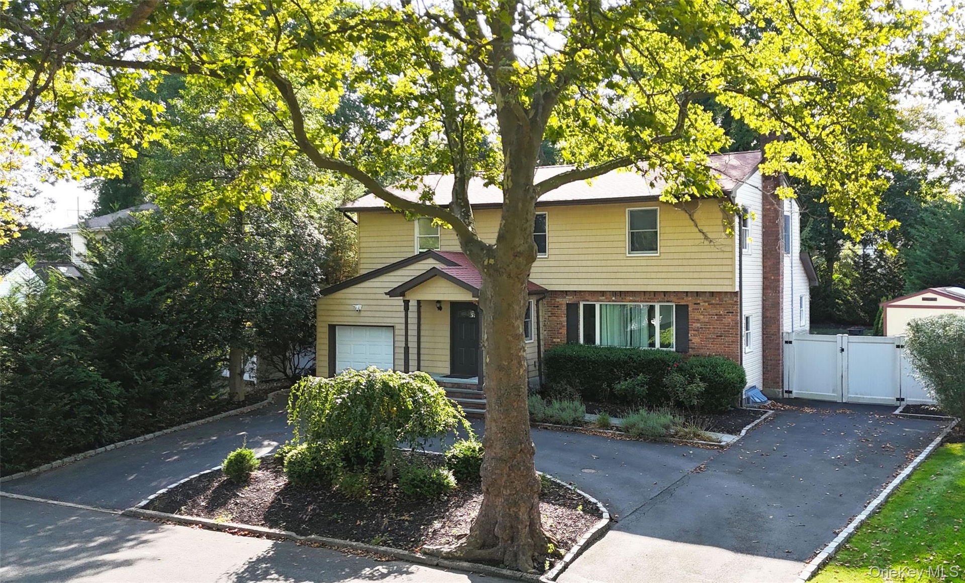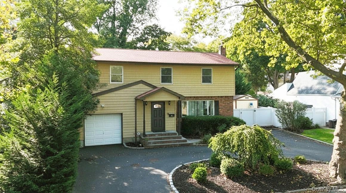 - View of front of house featuring a chimney, asphalt driveway, and a garage