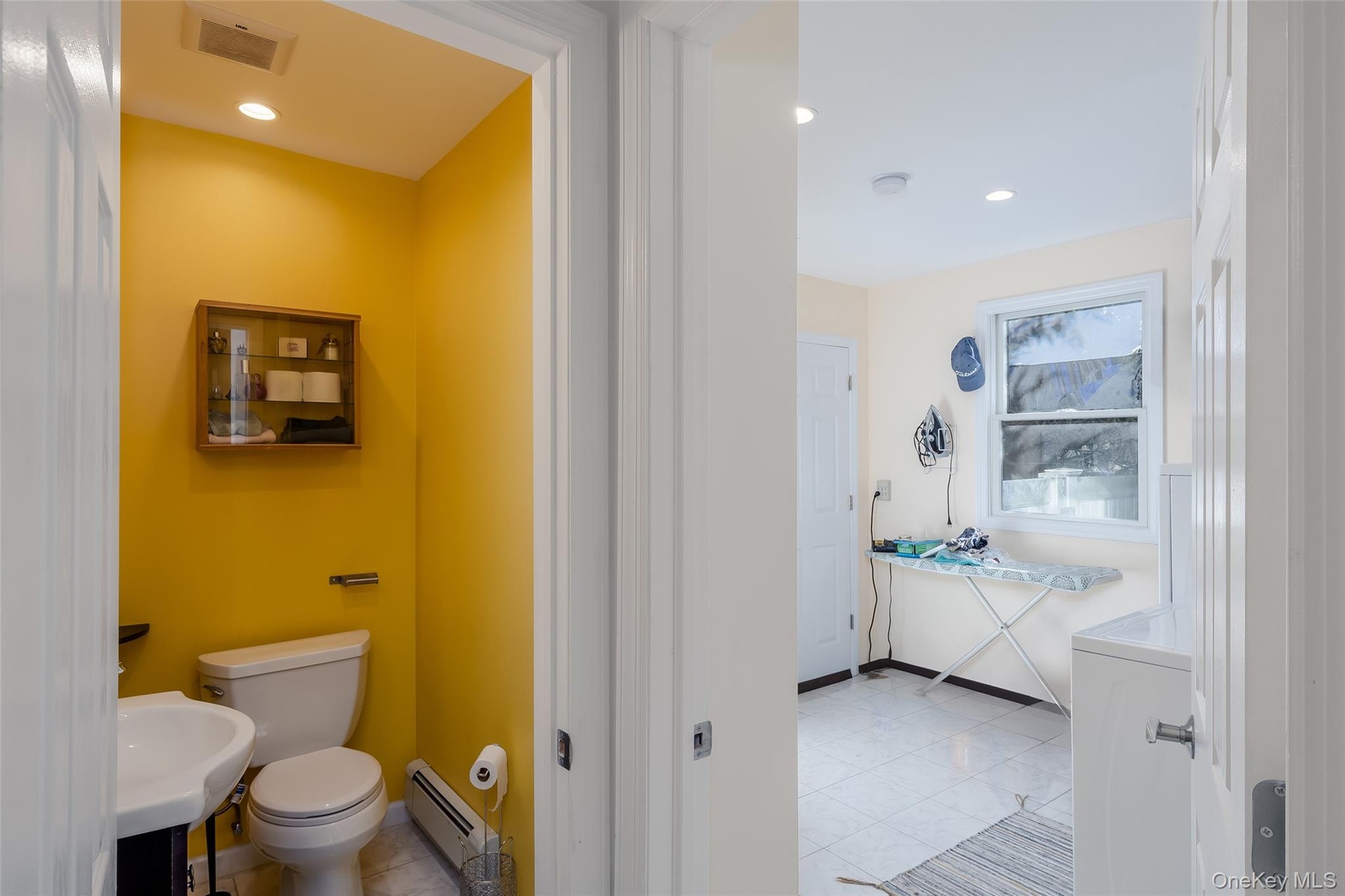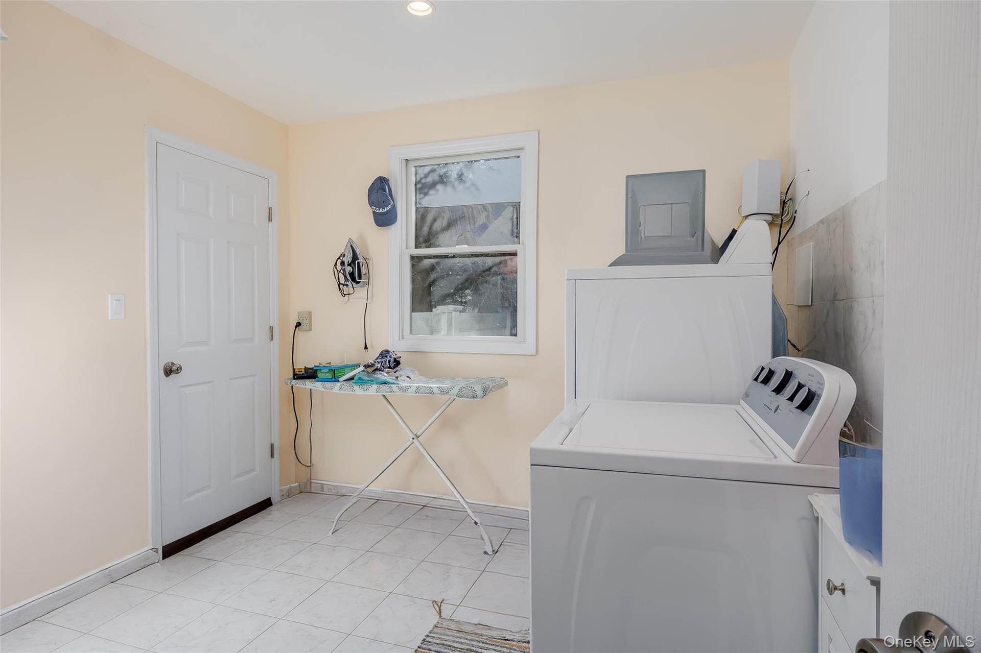 - Washroom with washing machine and dryer, light tile patterned floors, and recessed lighting - access to garage