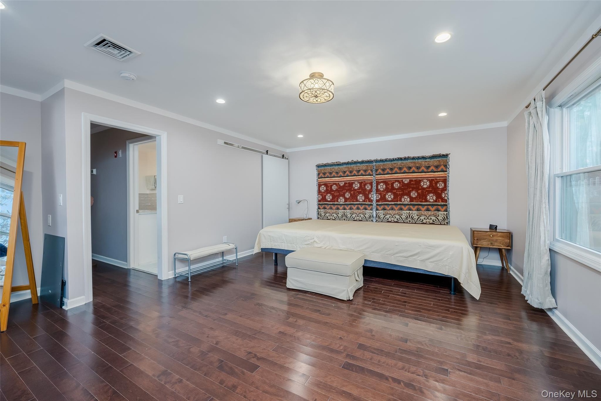 - Bedroom with ornamental molding, a barn door, dark wood-style flooring, and recessed lighting
