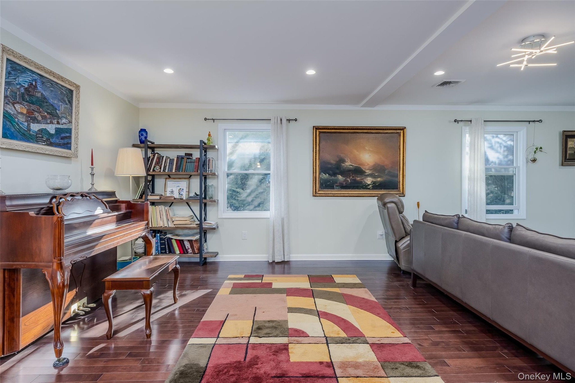 - Living area featuring recessed lighting, ornamental molding, and dark wood-type flooring