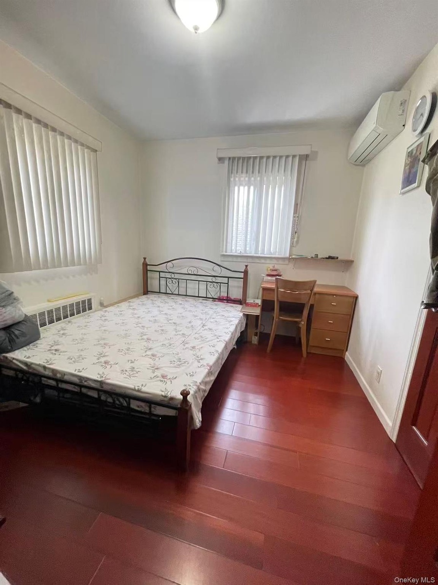 - Bedroom with dark wood finished floors, a wall unit AC, and radiator