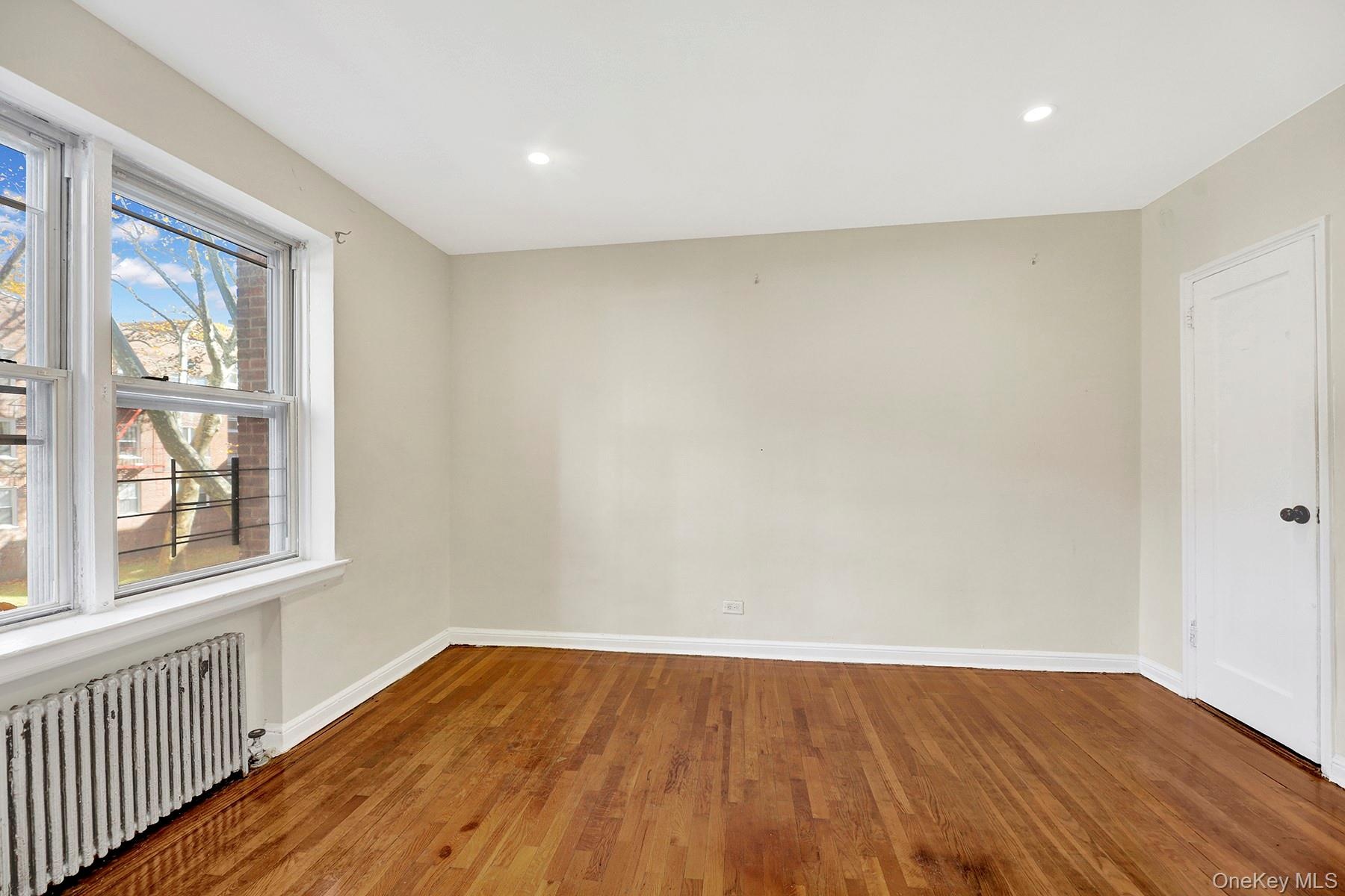 - Spare room featuring wood finished floors, radiator heating unit, and recessed lighting