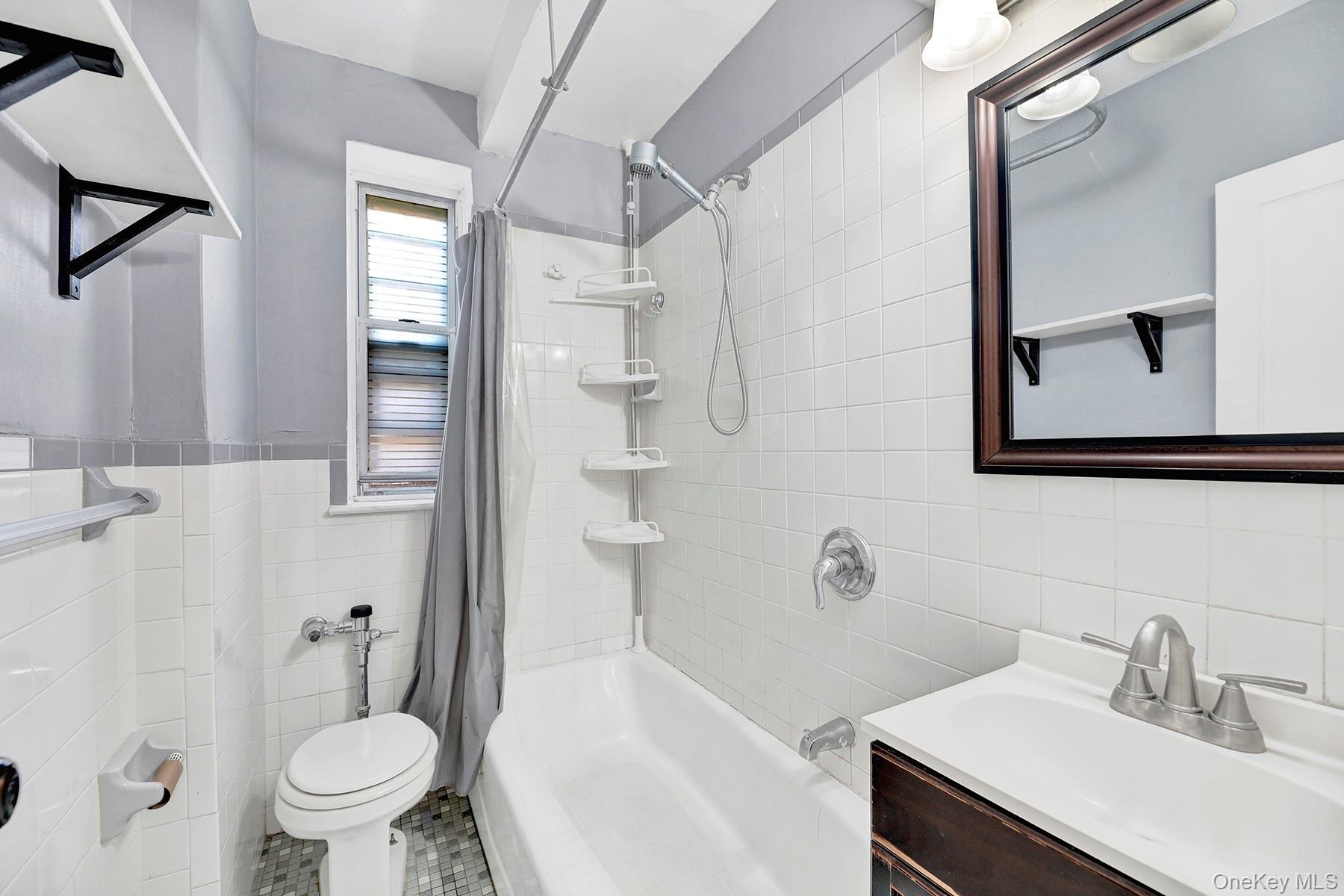 - Full bathroom with tile walls, vanity, shower / bath combo, a wainscoted wall, and tile patterned floors