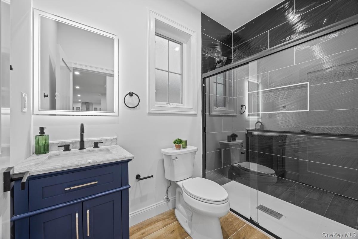 - Bathroom featuring vanity, a stall shower, and light wood-style floors