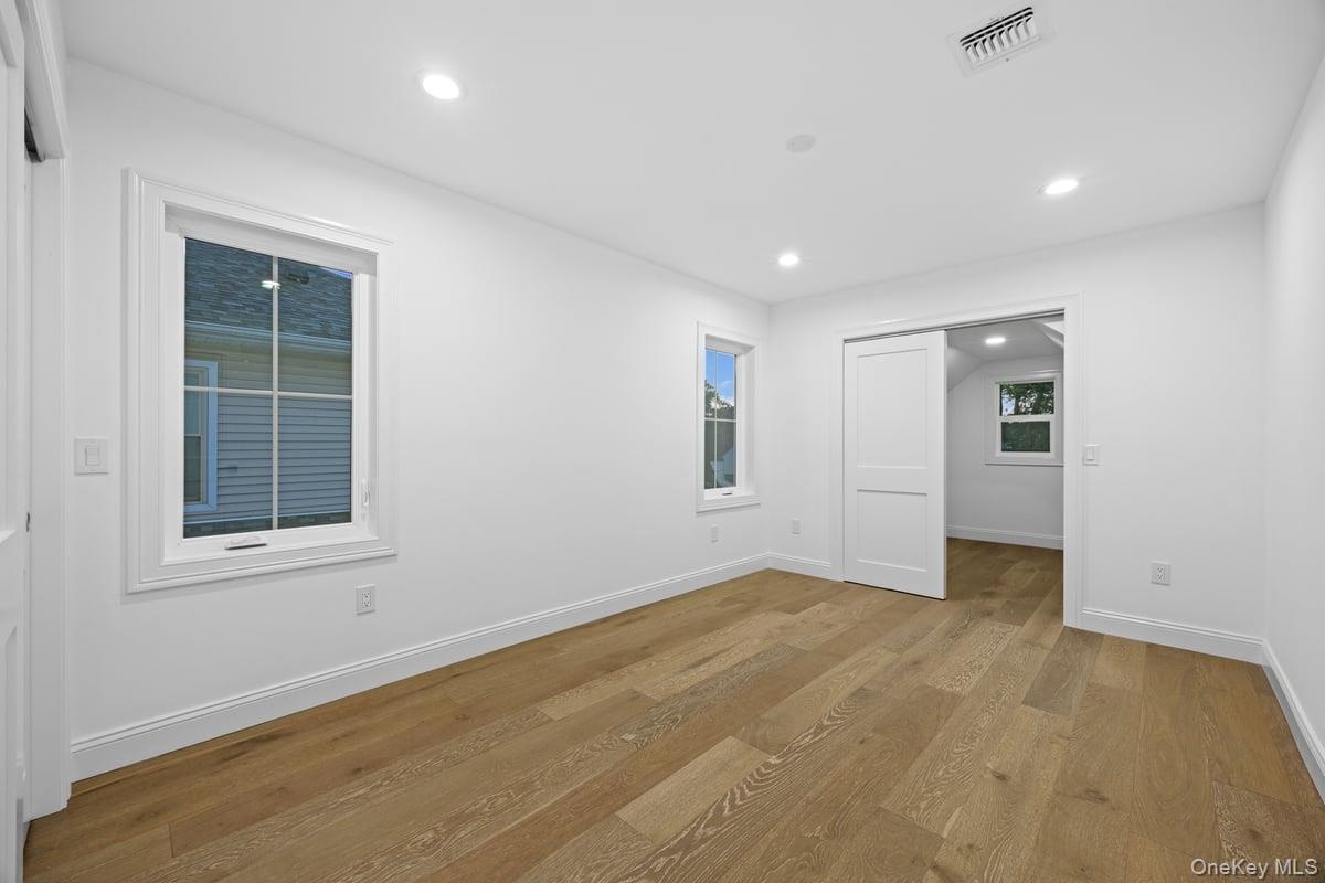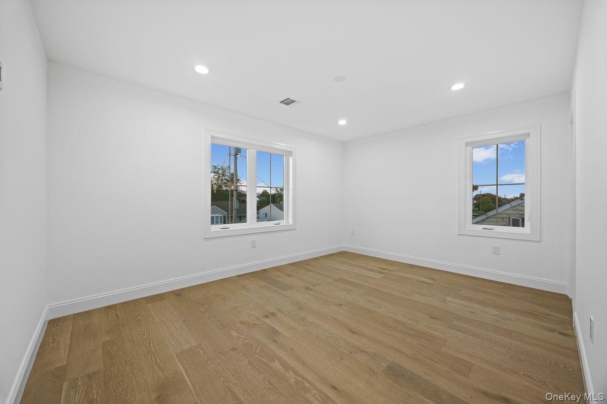 - Unfurnished room with light wood finished floors and recessed lighting