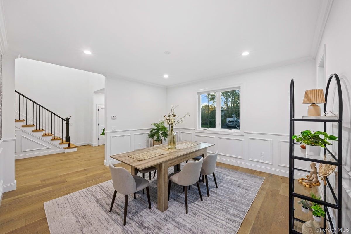 - Dining space featuring light wood-style flooring, a decorative wall, stairway, ornamental molding, and recessed lighting