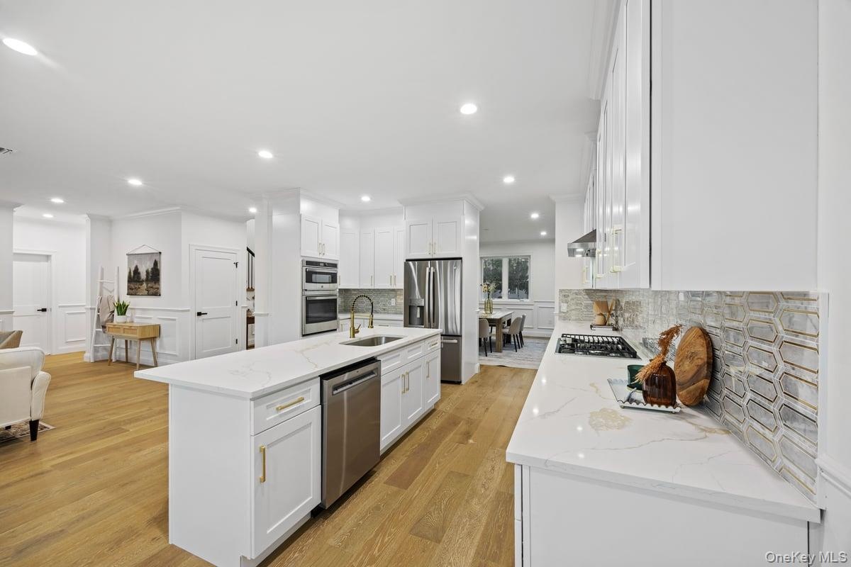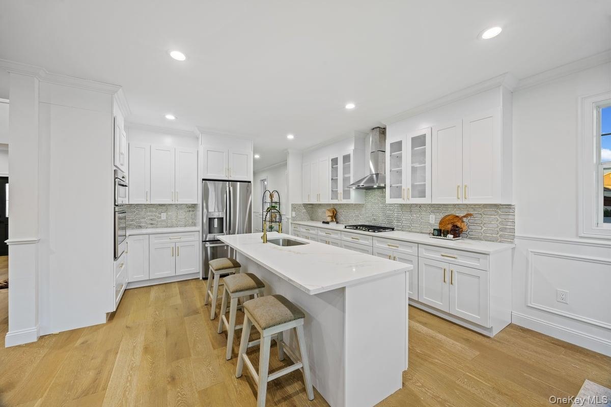 - Kitchen with appliances with stainless steel finishes, light wood-style flooring, a breakfast bar, tasteful backsplash, and recessed lighting