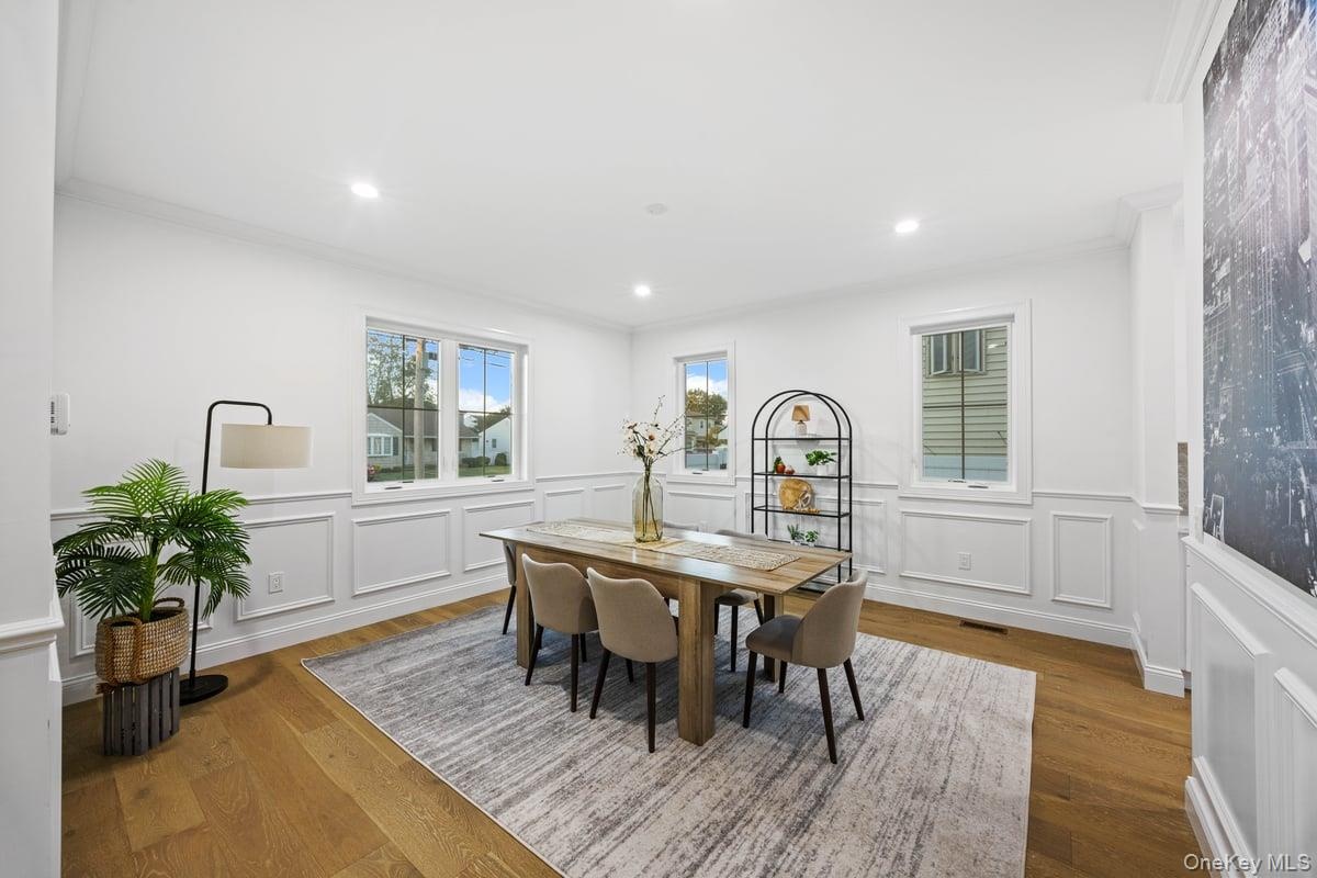- Dining room with wood finished floors, crown molding, recessed lighting, and a decorative wall