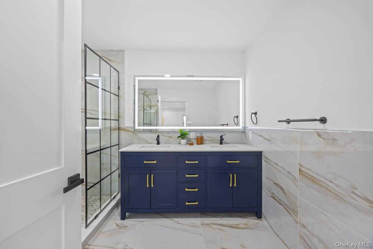 - Bathroom with light marble finish flooring, double vanity, a marble finish shower, and tile walls