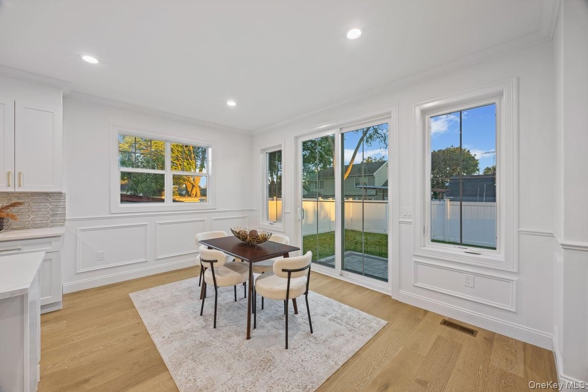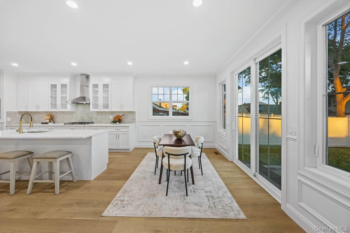 - Dining space featuring plenty of natural light, ornamental molding, light wood-style flooring, a decorative wall, and recessed lighting