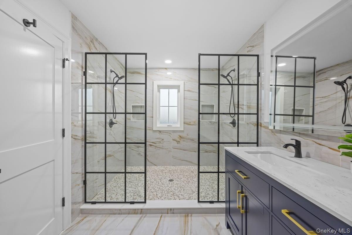 - Full bath featuring vanity, a marble finish shower, and tile walls