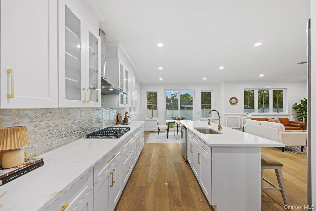 - Kitchen with white cabinetry, dark wood-style floors, glass insert cabinets, open floor plan, and tasteful backsplash