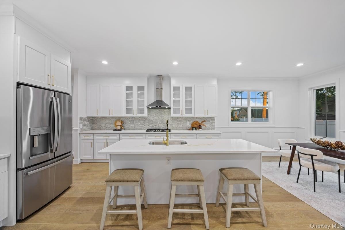 - Kitchen featuring a kitchen breakfast bar, white cabinetry, light wood finished floors, glass insert cabinets, and a center island with sink