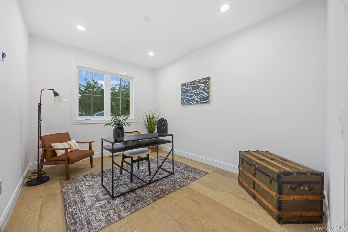 - Office area with light wood finished floors and recessed lighting