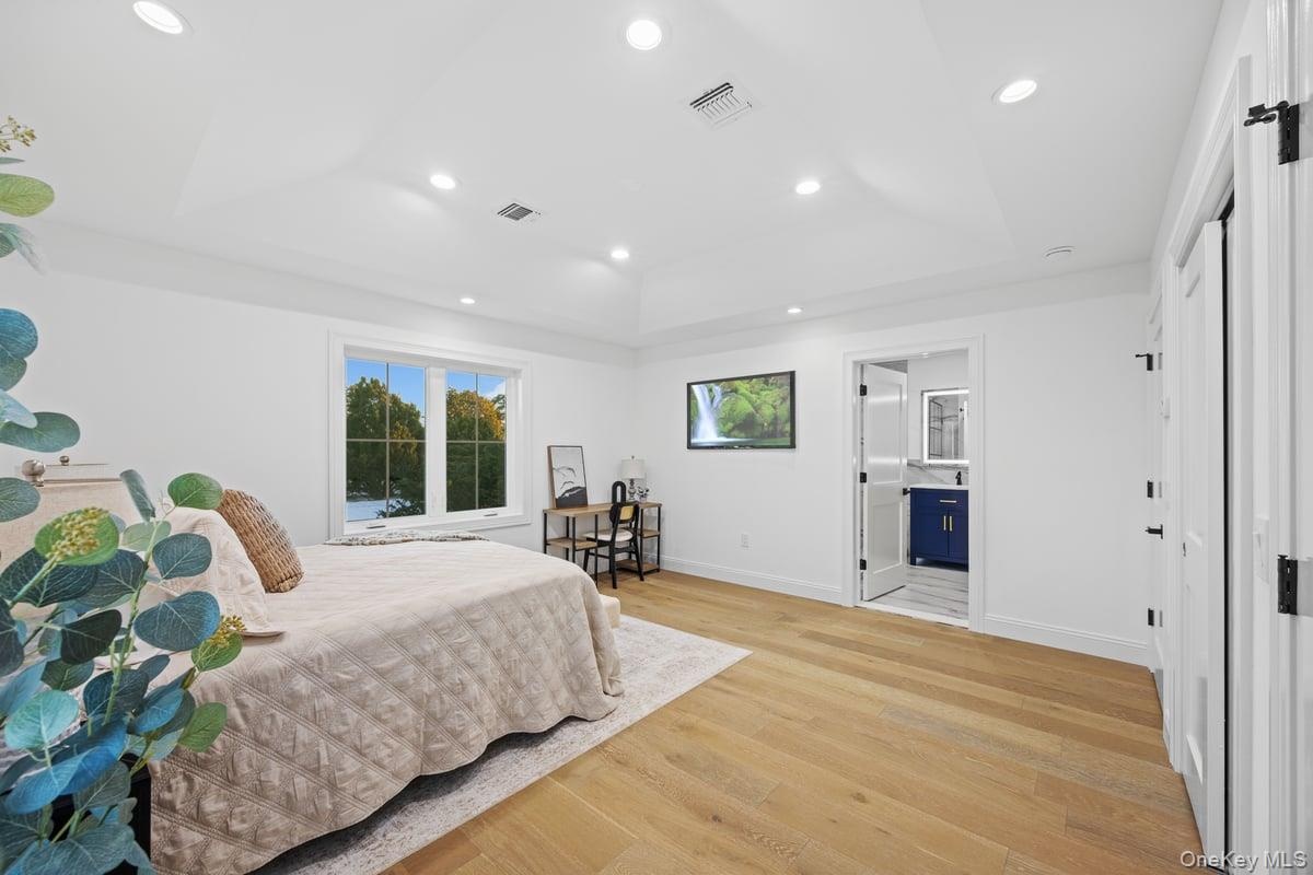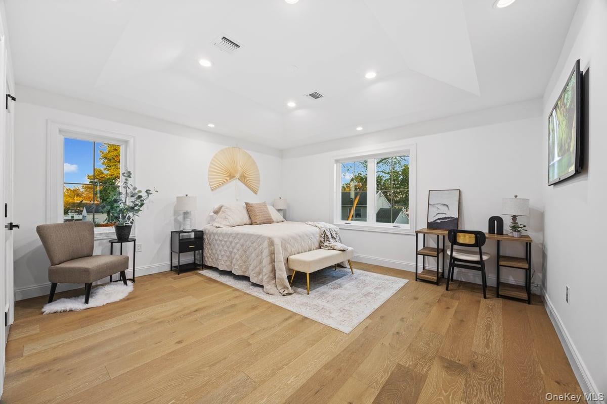 - Bedroom with a raised ceiling, light wood-style flooring, and recessed lighting