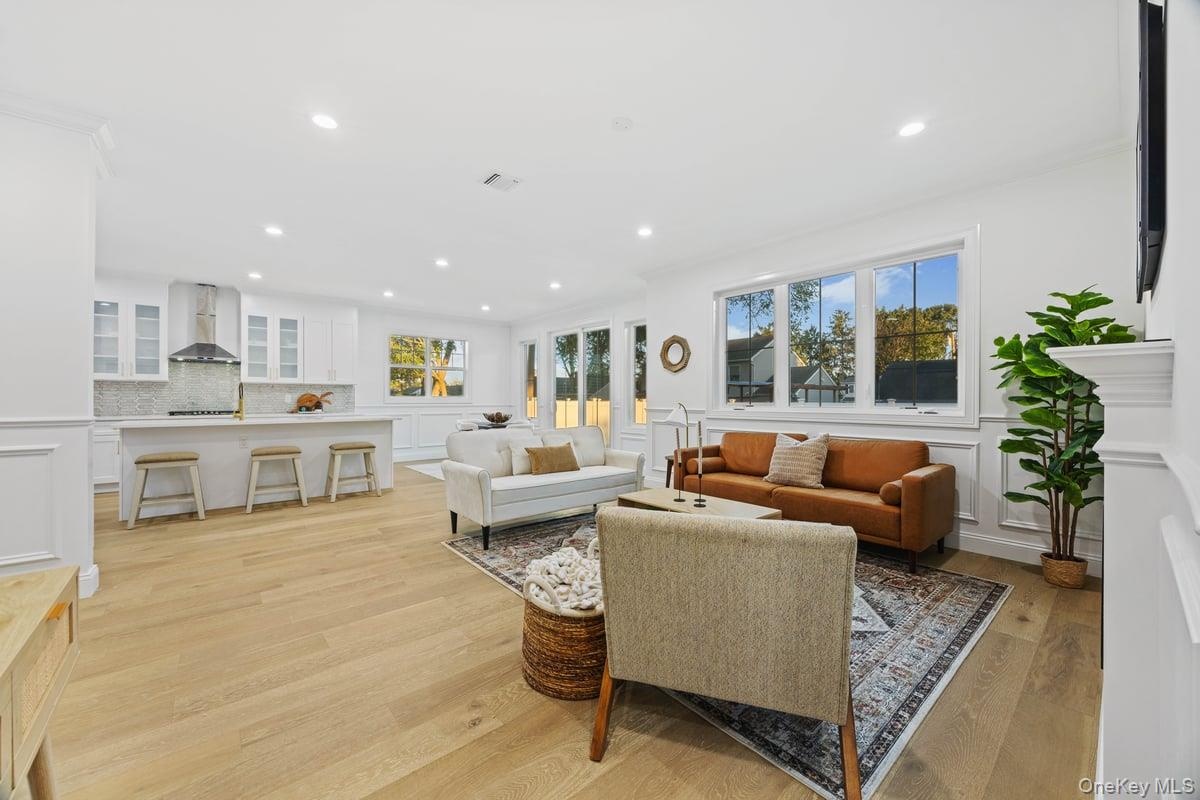 - Living room featuring light wood-type flooring, a decorative wall, and recessed lighting