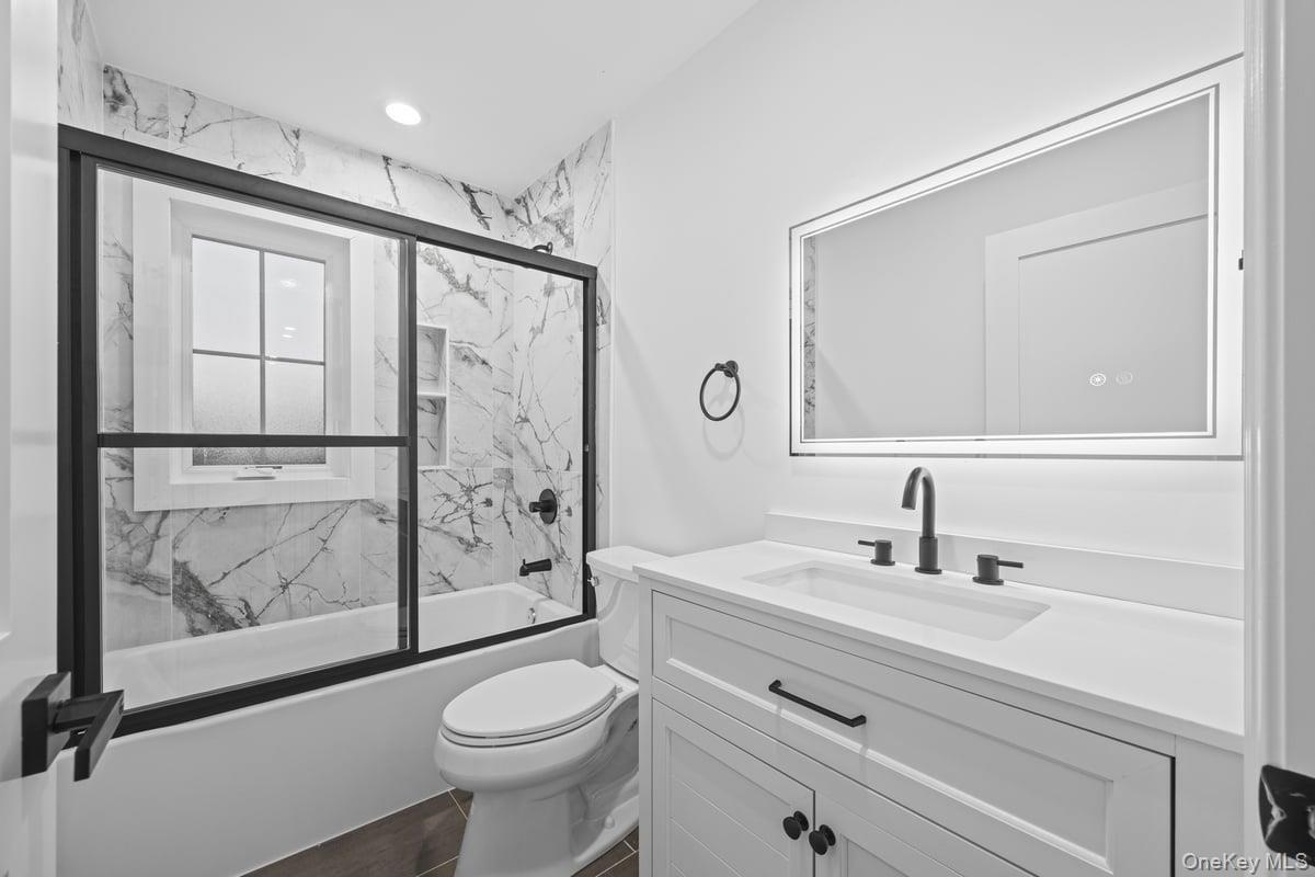 - Bathroom featuring bath / shower combo with glass door, vanity, and recessed lighting