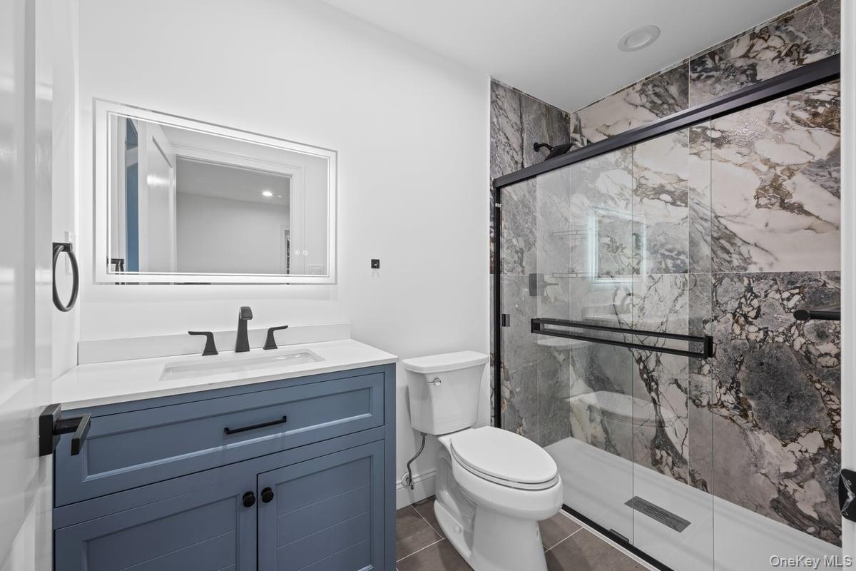 - Bathroom featuring vanity, a marble finish shower, and dark tile patterned floors