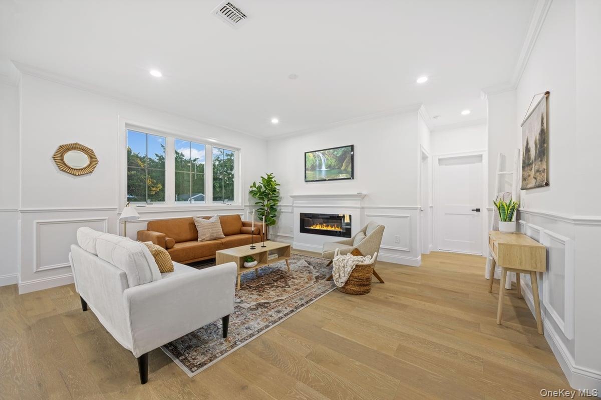 - Living room featuring a decorative wall, a glass covered fireplace, a wainscoted wall, light wood finished floors, and crown molding