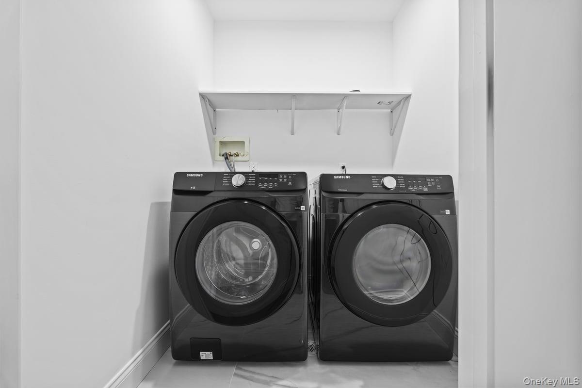 - Laundry area with washing machine and clothes dryer and baseboards