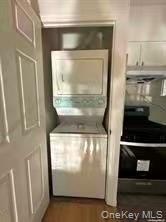 - Laundry area featuring estacked washer and dryer and dark wood-type flooring