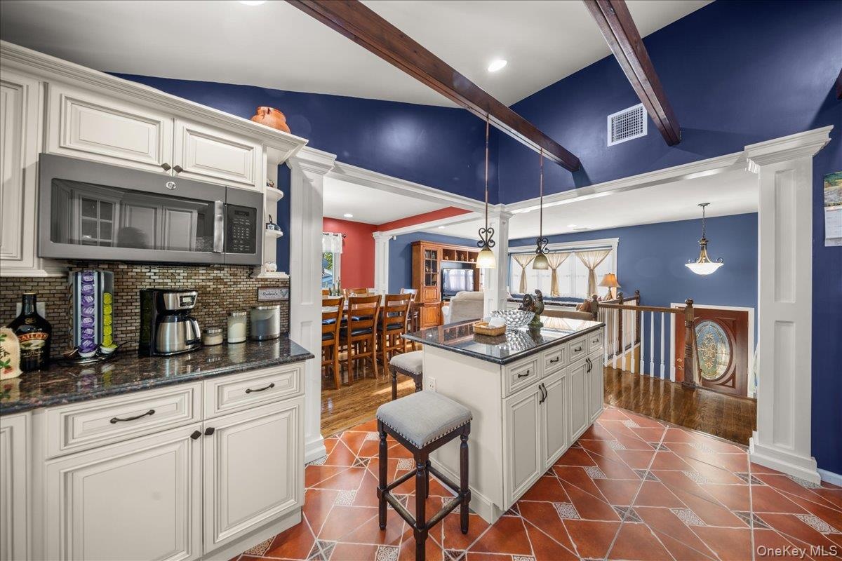 - Kitchen featuring a breakfast bar area, stainless steel microwave, dark stone counters, hanging light fixtures, and a kitchen island