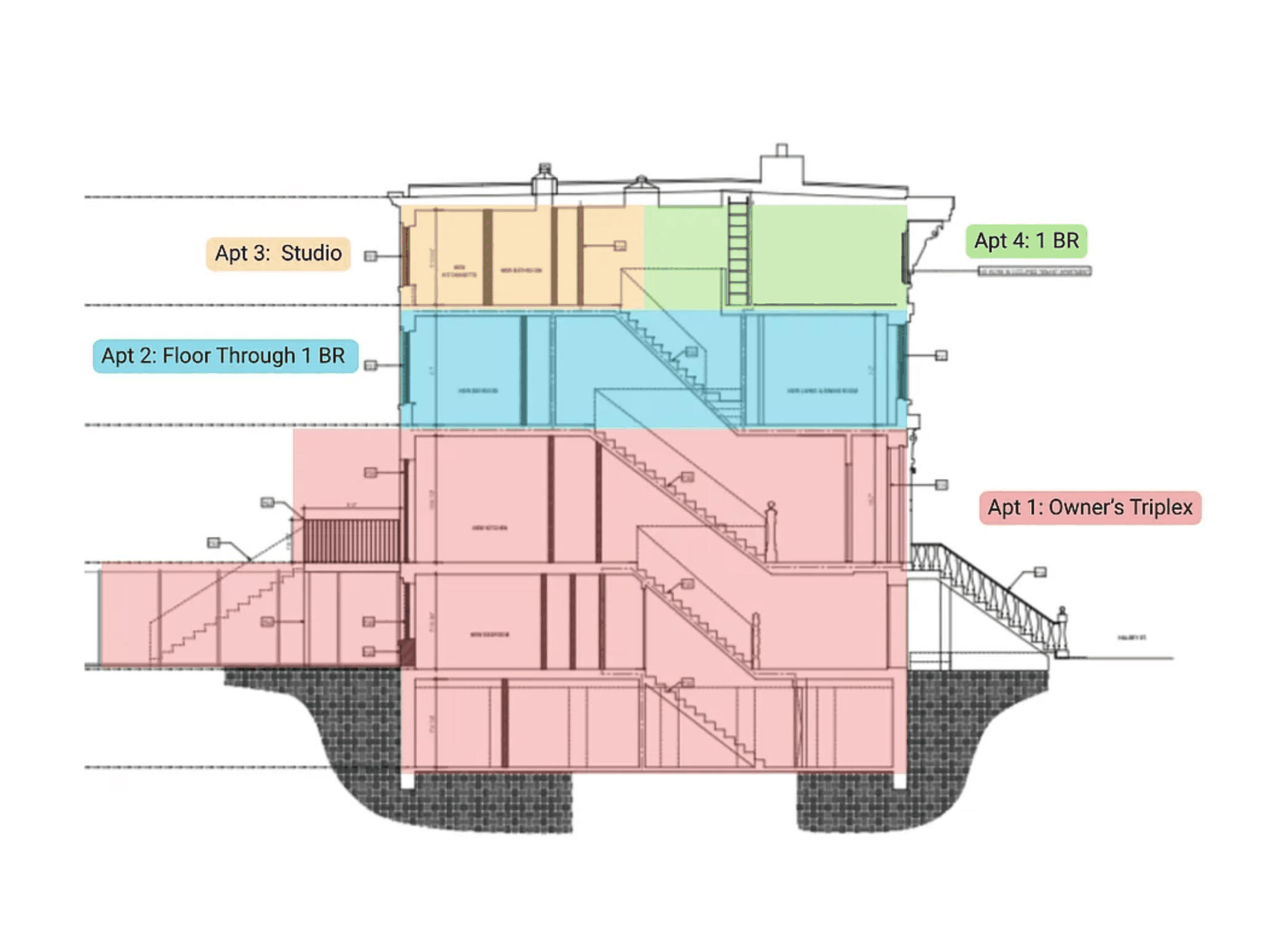 The home features a spacious 3-bedroom, 3-bathroom owner’s triplex with exclusive garden access, along with three beautifully finished rental units on the top two floors—two 1-bedrooms and a studio—projected to generate over $9,000/month in rental income.