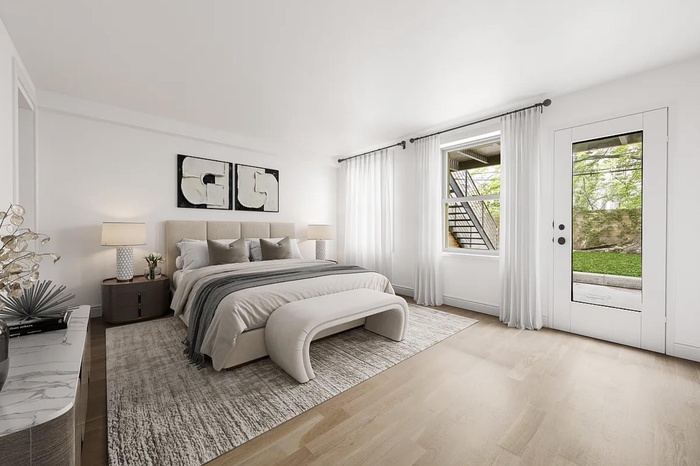 The owner’s triplex is the crown jewel of the property, showcasing herringbone oak flooring, radiant heated tile in all bathrooms, and a custom English-style kitchen with shaker cabinetry, marble countertops, and a premium Bertazzoni induction range. The full parlor floor is ideal for entertaining, leading out to a private rear deck that overlooks a serene, tree-canopied garden. The garden-level primary suite also offers direct outdoor access, while the triplex's lowest level includes a spacious recreation/media room, perfect for a home office, gym, or playroom.