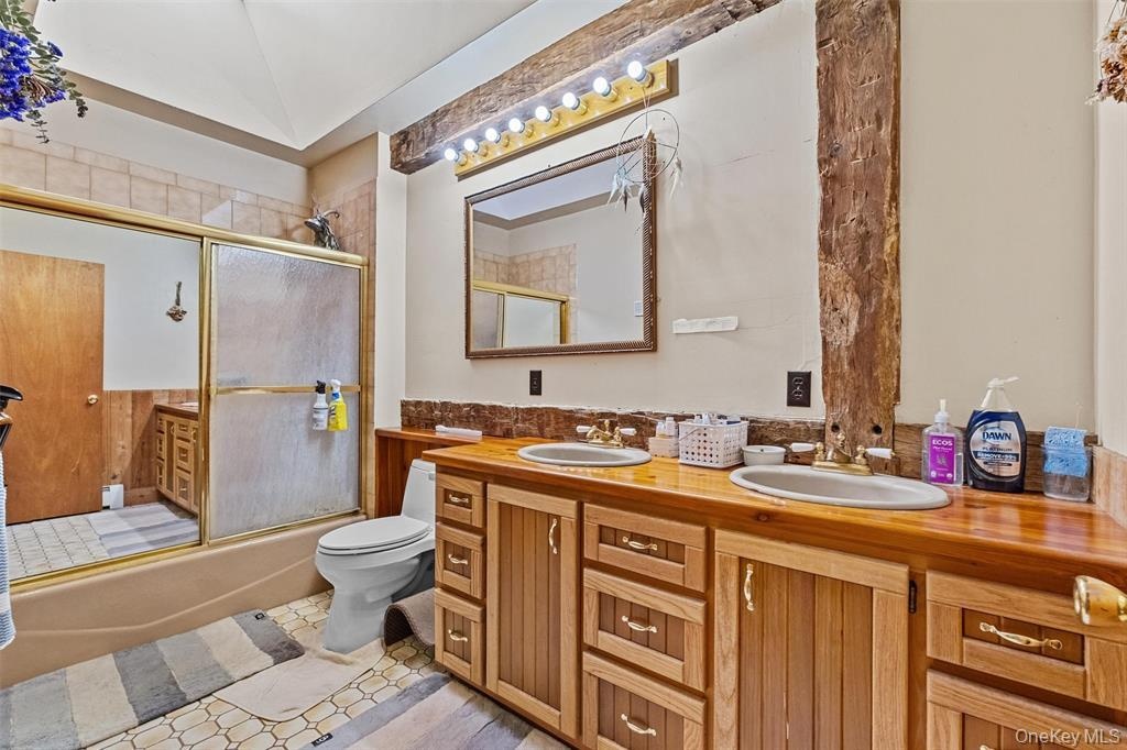 - Bathroom with shower / bath combination with glass door, double vanity, and light tile patterned floors
