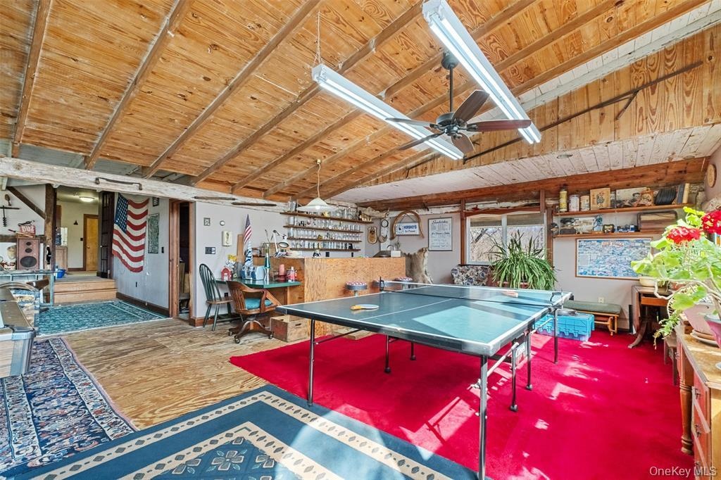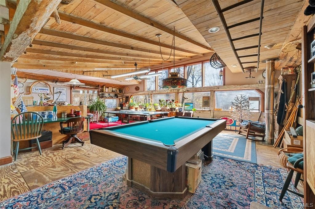 - Game room with a wood ceiling with exposed beams, billiards table, plenty of natural light, and wood finished floors