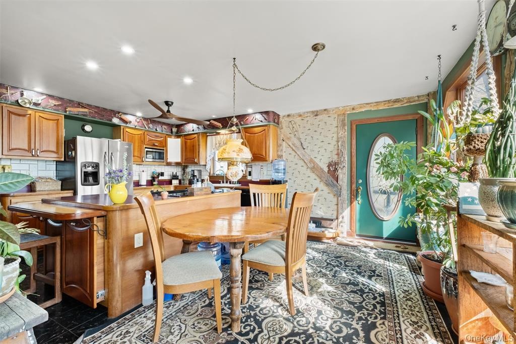 - Kitchen featuring stainless steel appliances, a ceiling fan, wallpapered walls, brown cabinetry, and recessed lighting