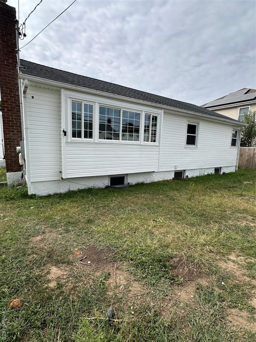 - View of side of property featuring a yard and a shingled roof