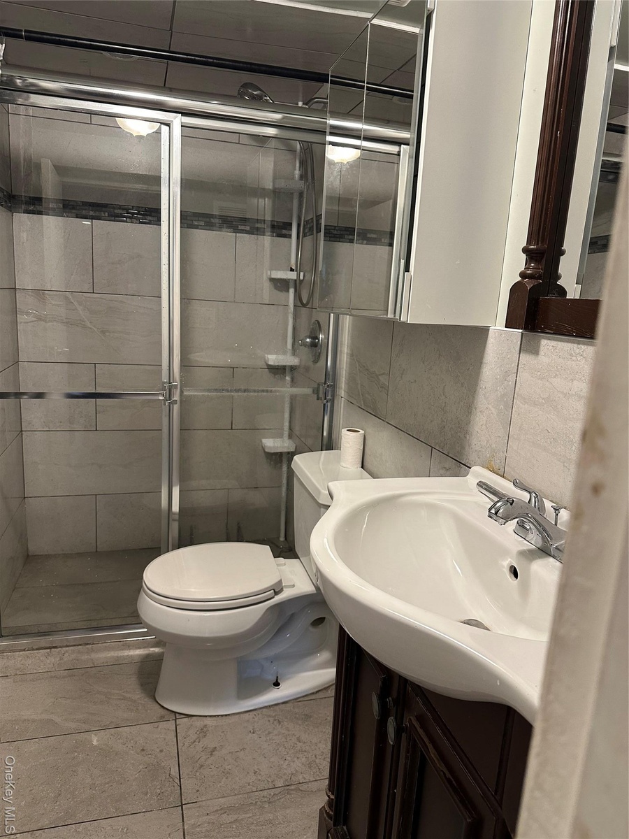 - Full bath with vanity, a stall shower, tile walls, and tile patterned floors