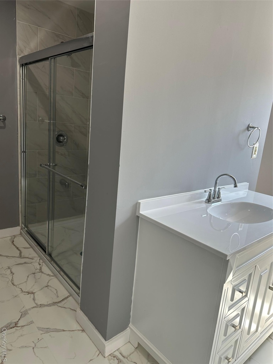 - Full bathroom with vanity, a shower stall, and light marble finish flooring