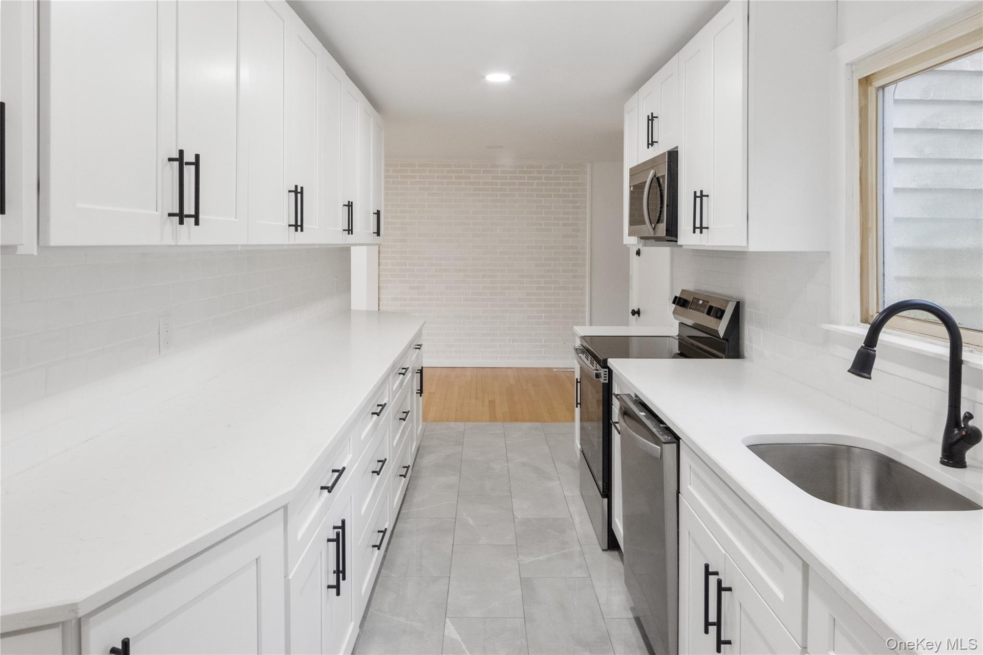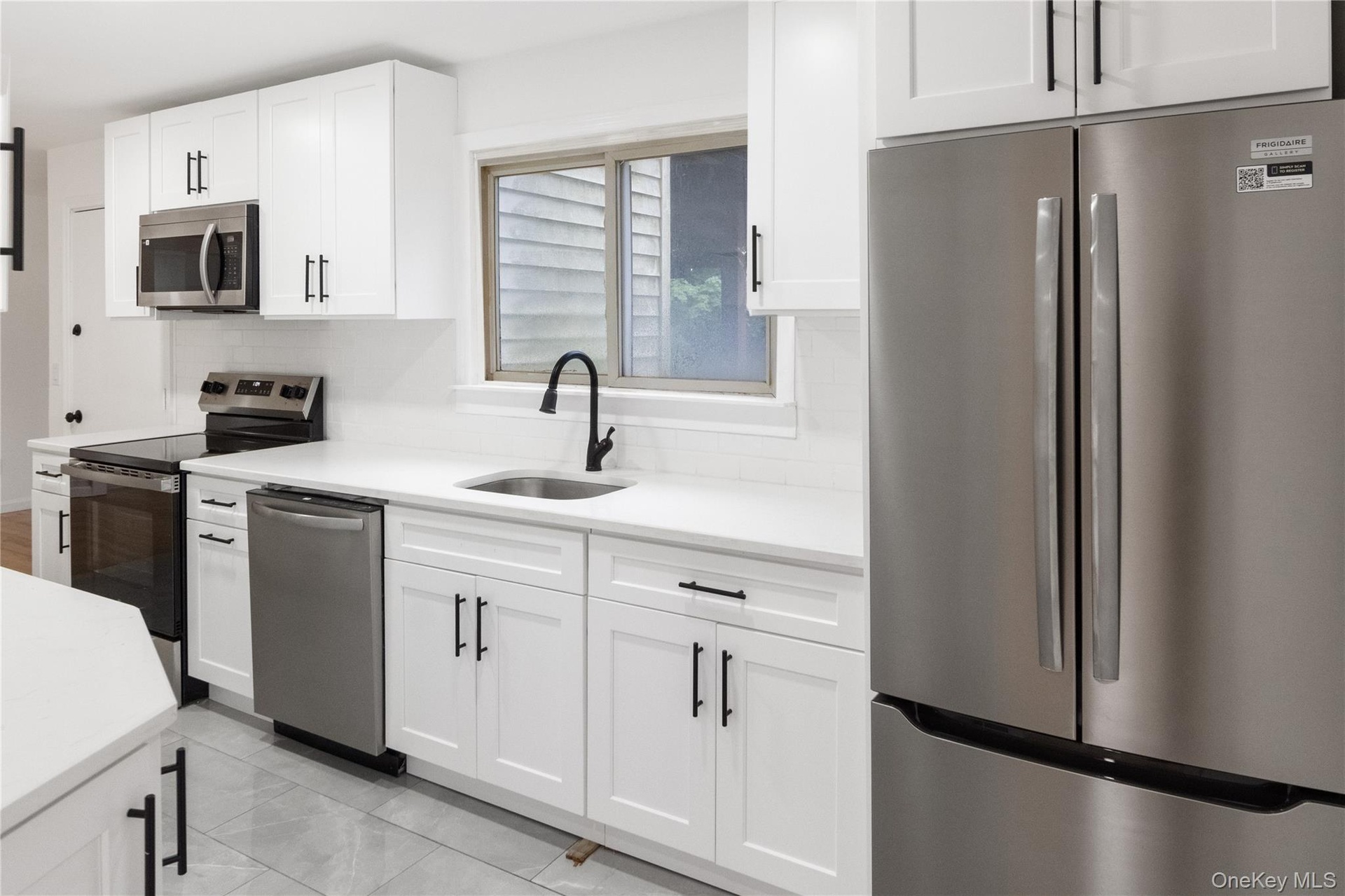- Kitchen featuring stainless steel appliances, white cabinets, decorative backsplash, and light stone countertops