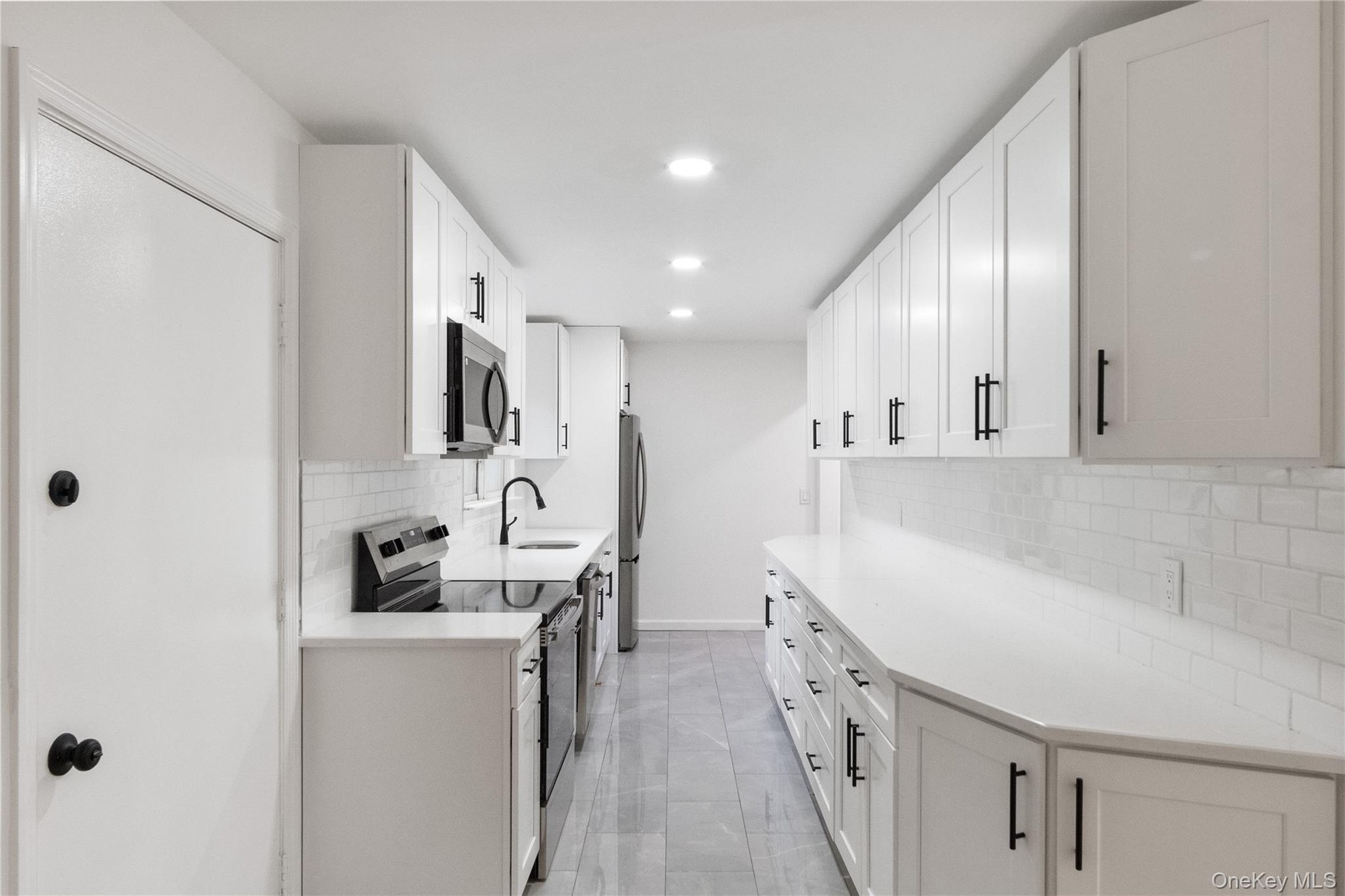 - Kitchen featuring stainless steel appliances, backsplash, white cabinets, light stone countertops, and recessed lighting