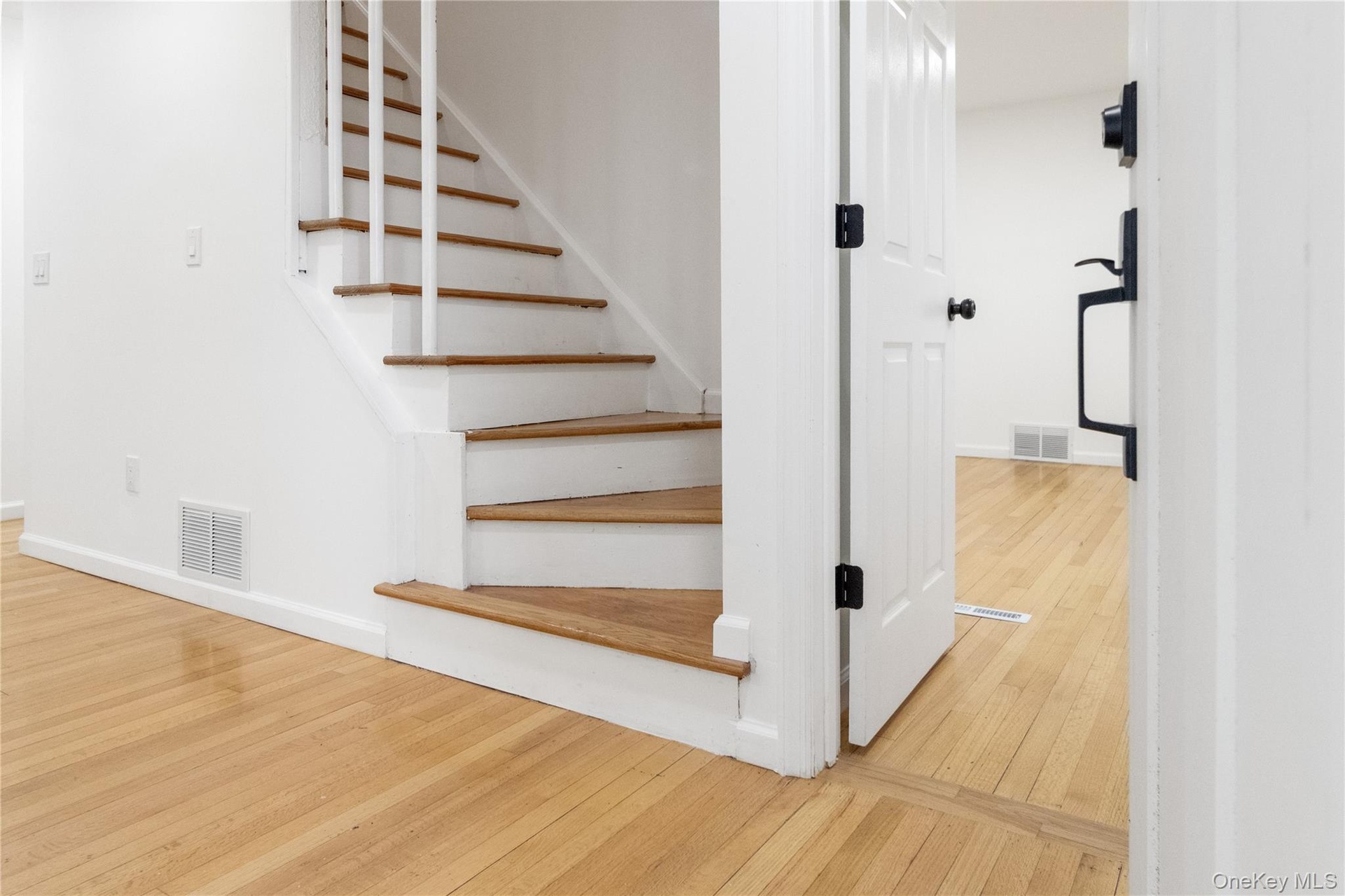 - Unfurnished room with light wood-style flooring, recessed lighting, and stairs
