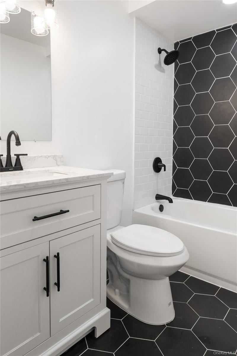 - Bathroom featuring shower combination, vanity, and dark tile patterned flooring
