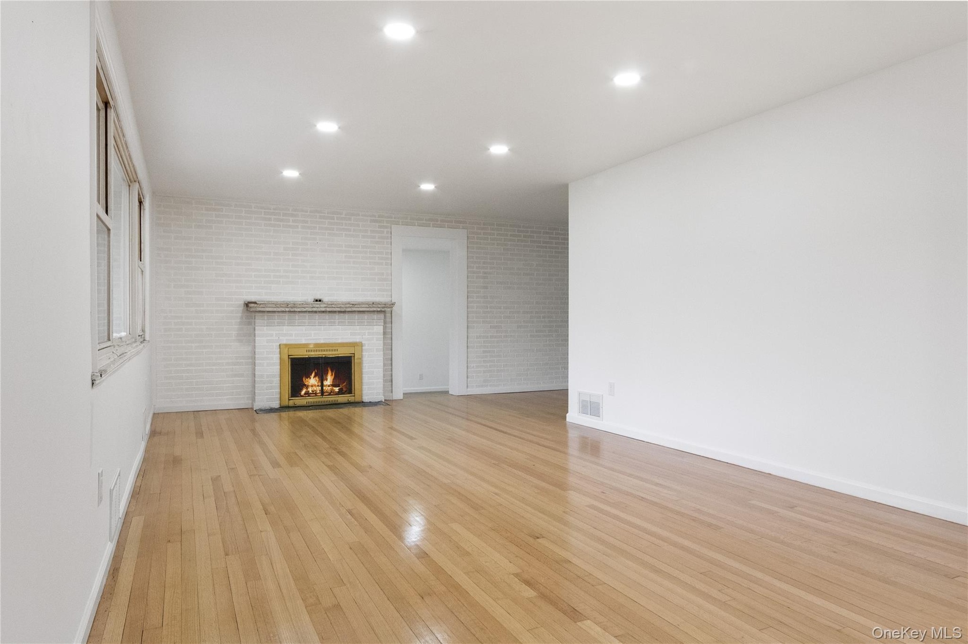 - Unfurnished living room with light wood-type flooring, a brick fireplace, and recessed lighting