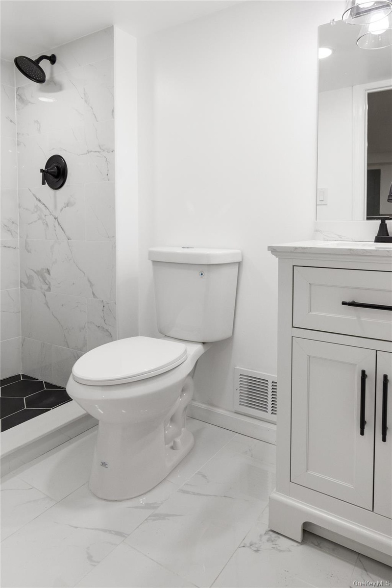 - Bathroom with vanity, a marble finish shower, and light marble finish flooring