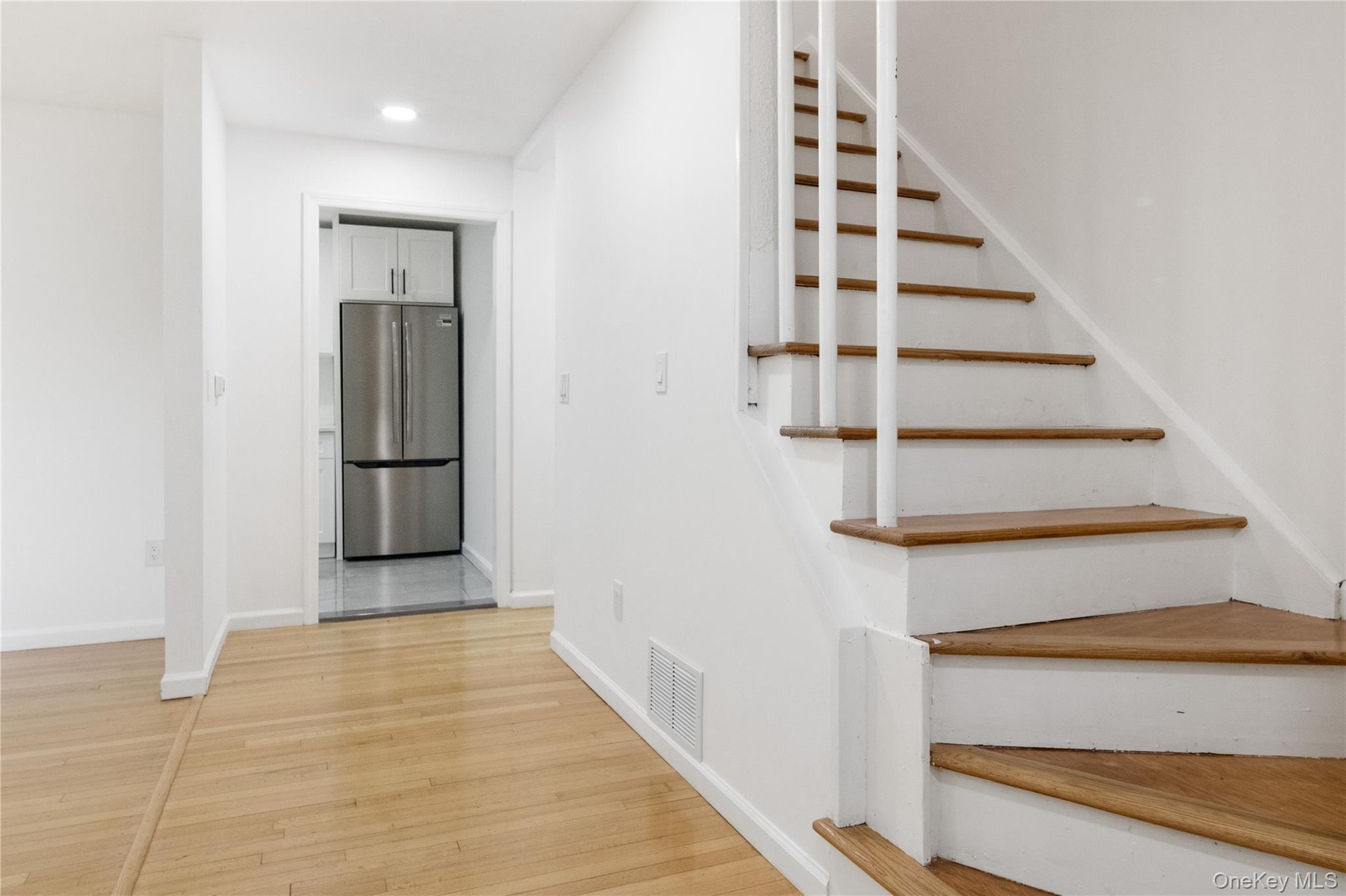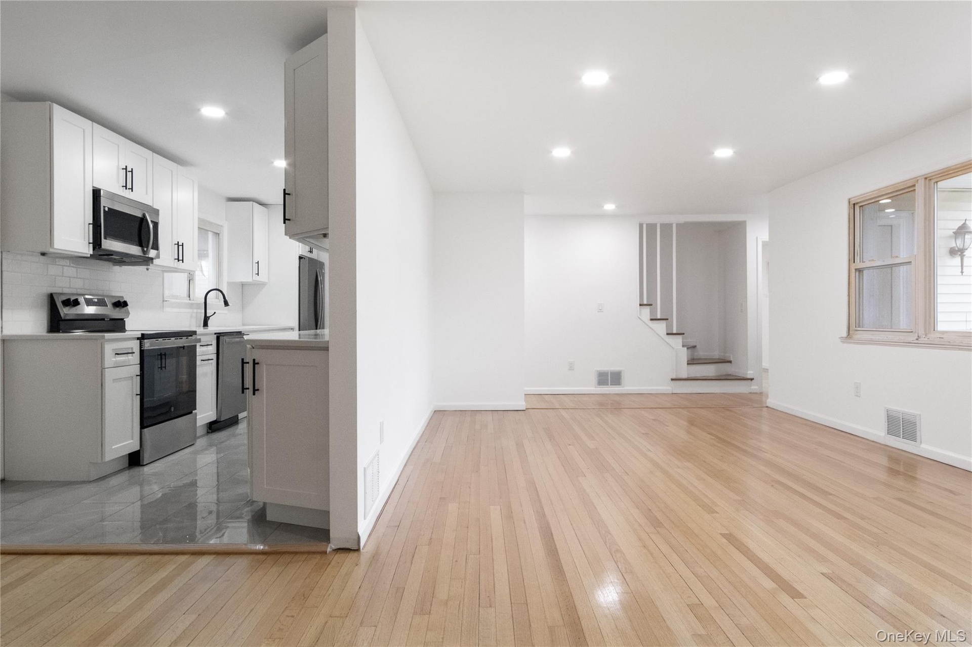 - Unfurnished living room featuring light wood finished floors, recessed lighting, and stairway