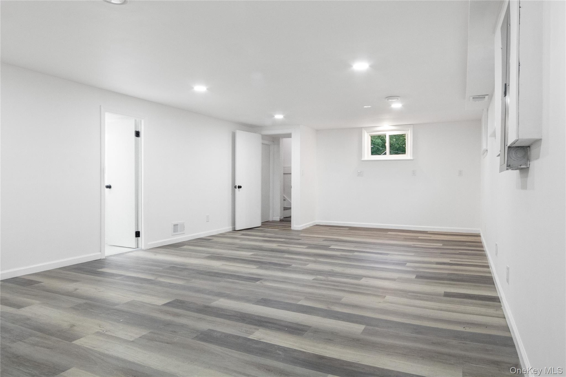 - Basement featuring wood finished floors, recessed lighting, and electric panel