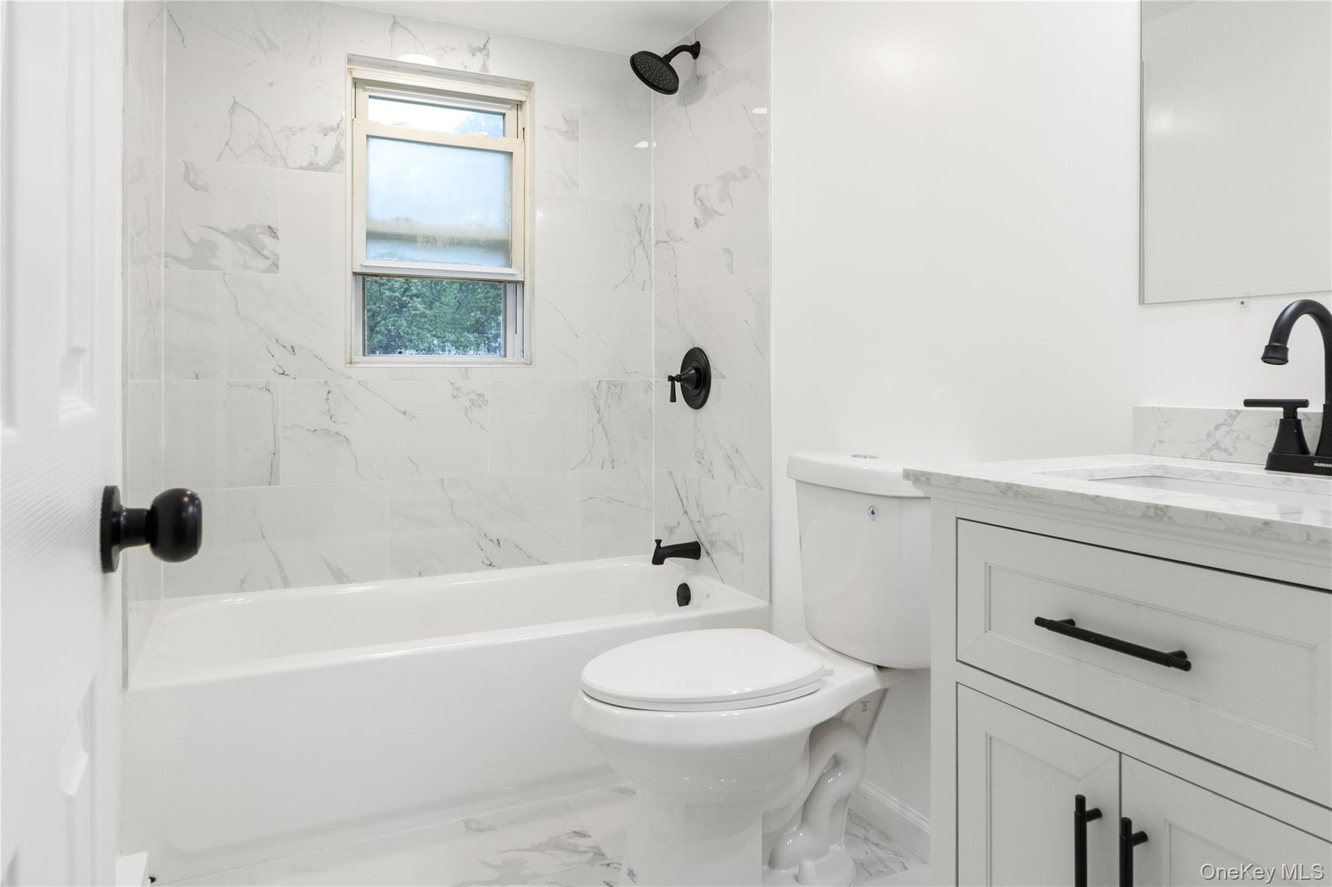 - Full bath with shower combination, vanity, and light marble finish flooring