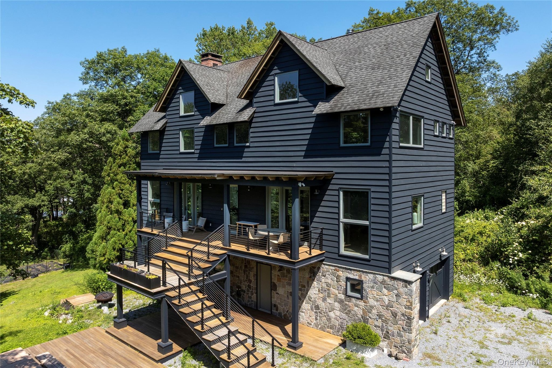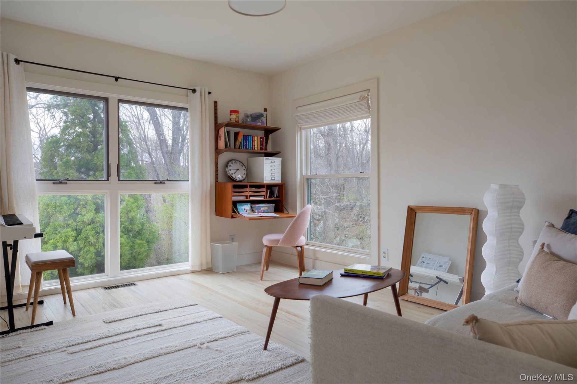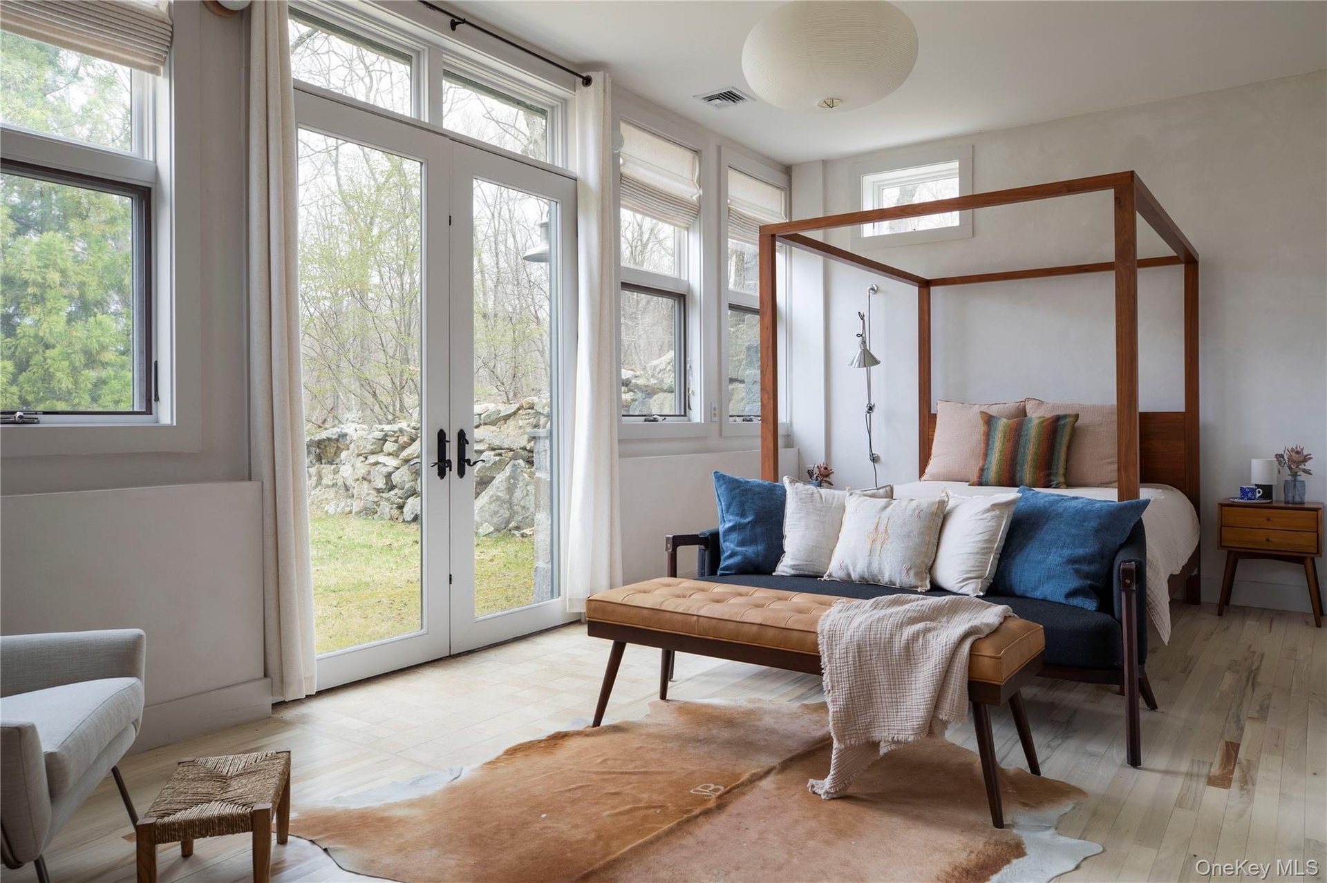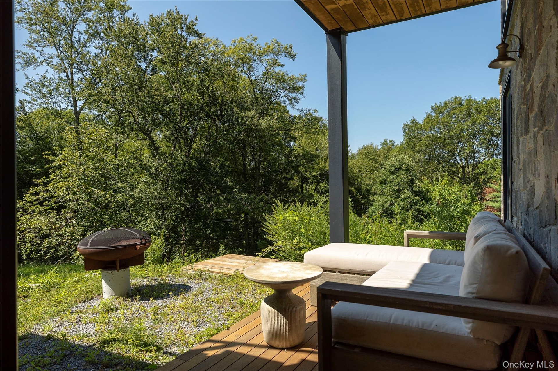 Two additional bedrooms, a full bath, and a flexible space (think WFH space or cozy guest den) are located on a separate floor with private access from the patio—making it ideal for guests. From here, head outside to the spacious teak deck, yard, garden, and wooded backyard.